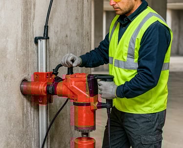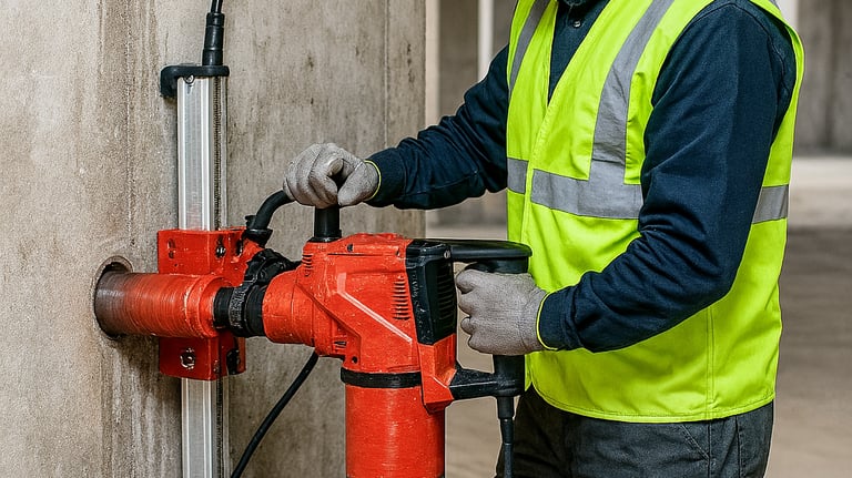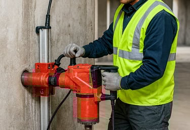 Carottage et perçage Réalisation de perçages et carottages précis pour vos installations de tuyaux et câblages, avec un équipement professionnel et un travail soigné.